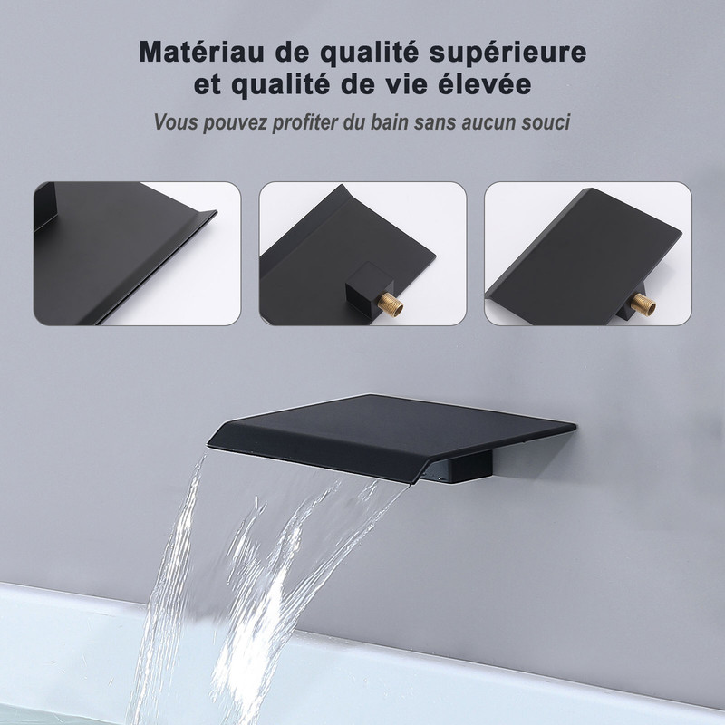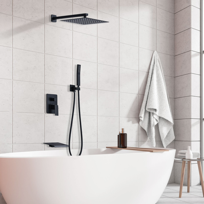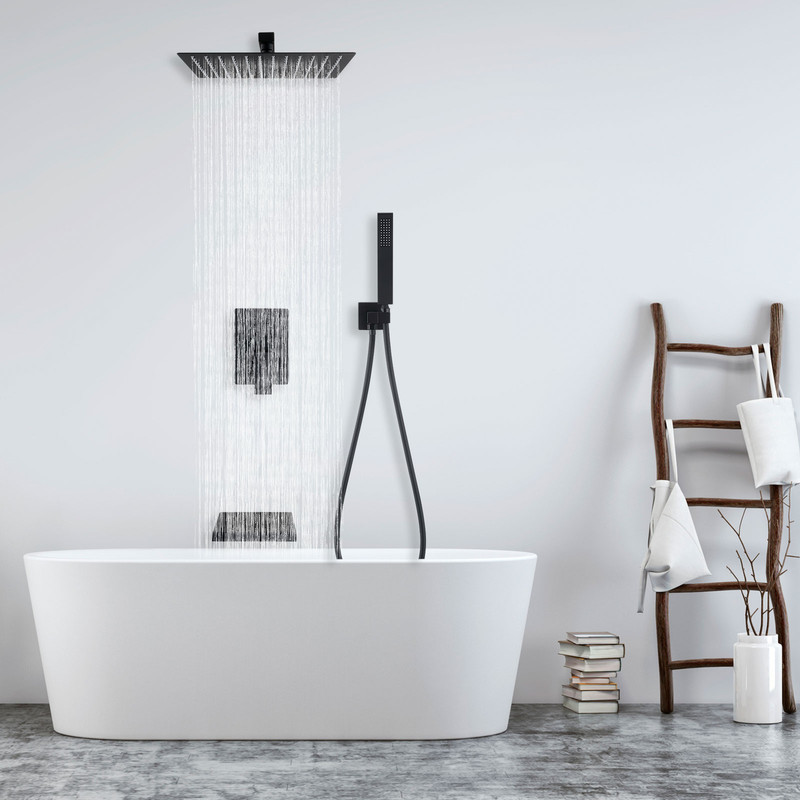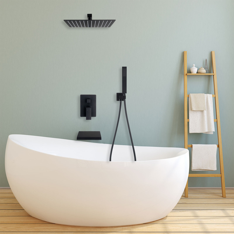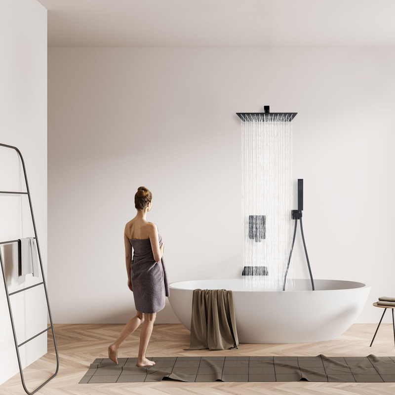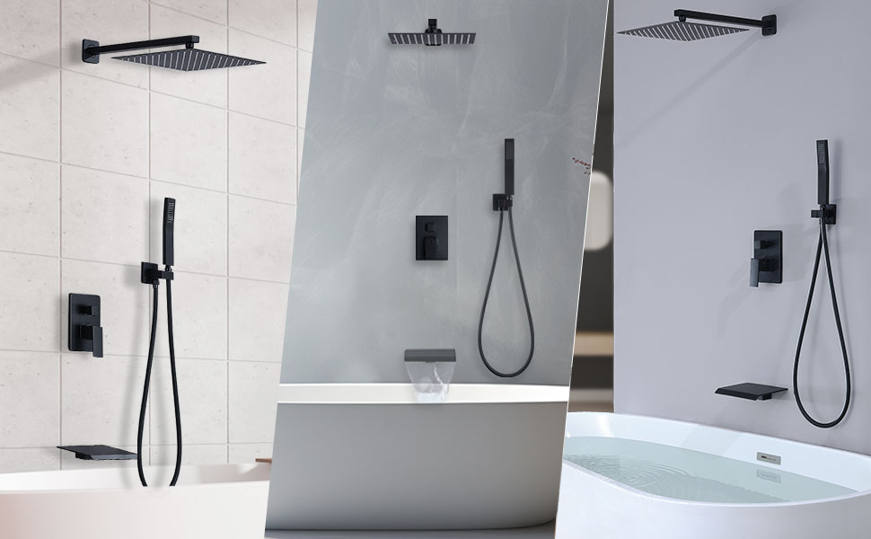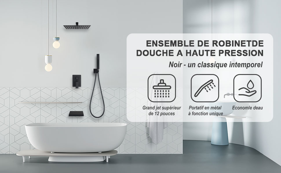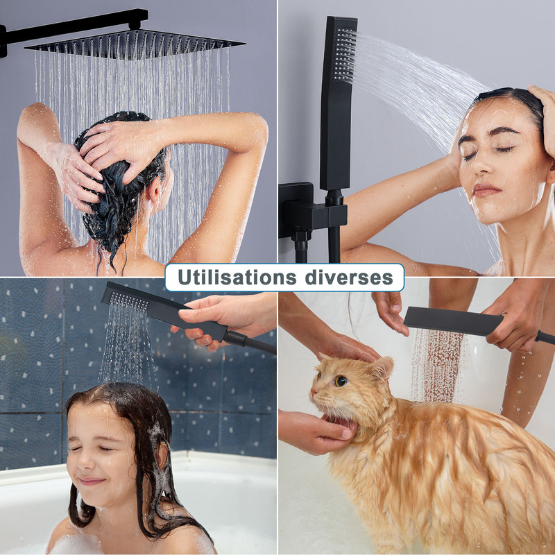 【Caractéristiques du Set de douche encastré tout en 1 avec】 douche de tête 300*300mm +200*35mm Douchette+200*157mm Bec déverseur de baignoire, Noir.