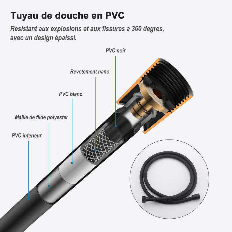【Douchette】Douchette à main en inoxydable 200*35mm.La douchette à main est équipée d'un flexible de douche en PVC 150 cm, fabriqué avec une technologie de qualité 10, résistant à la chaleur, antidéflagrant et anti-enchevêtrement de avec filetage universel G1/2.