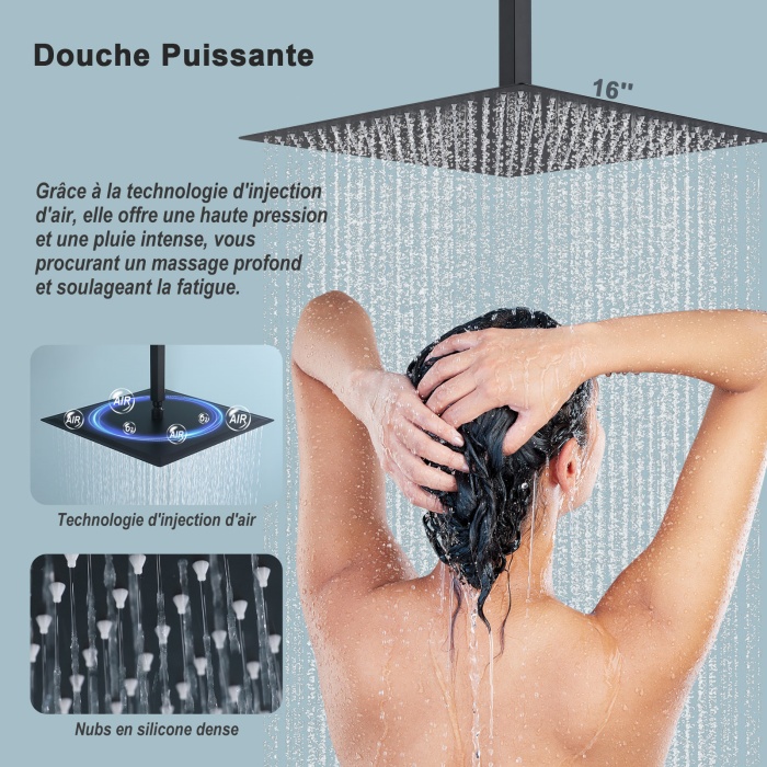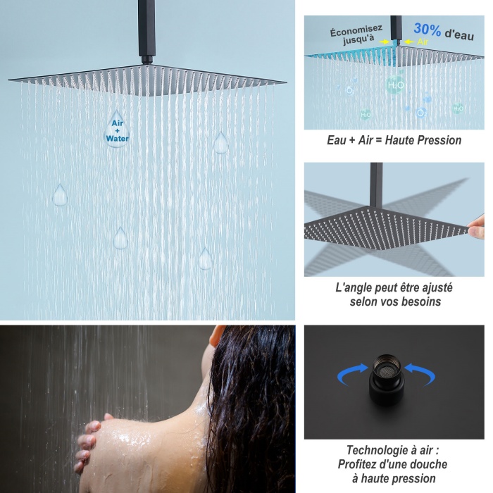 - La grande pomme de douche carrée de 16 pouces avec angle réglable offre une expérience de douche indulgente, enveloppant votre corps d'un débit d'eau régénérant.