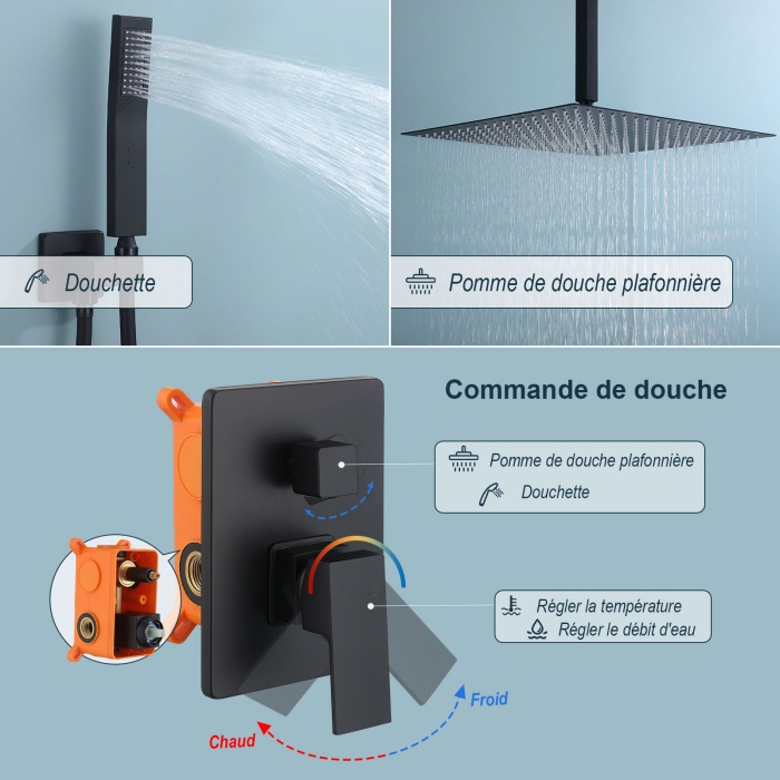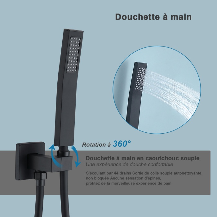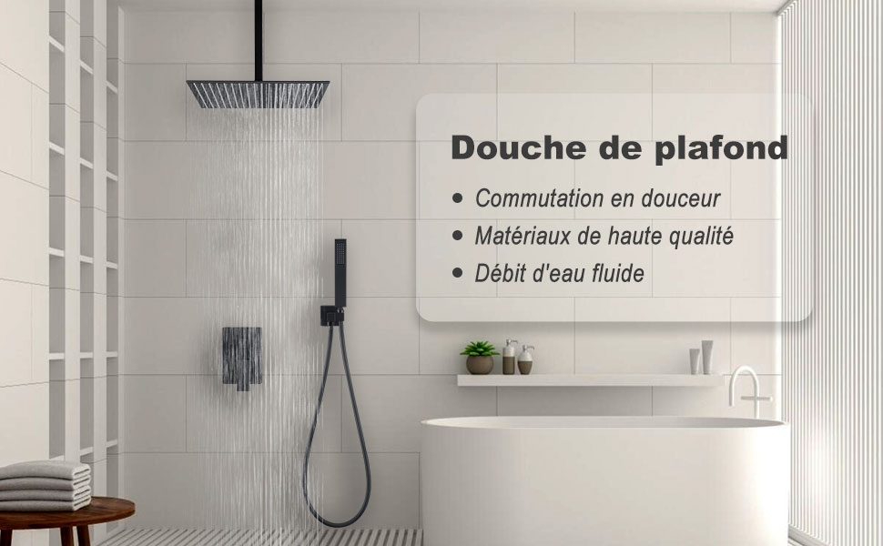 - Le kit de douche encastré au plafond économise votre espace d'installation et vous permet de profiter d'un bain dans un espace spacieux.