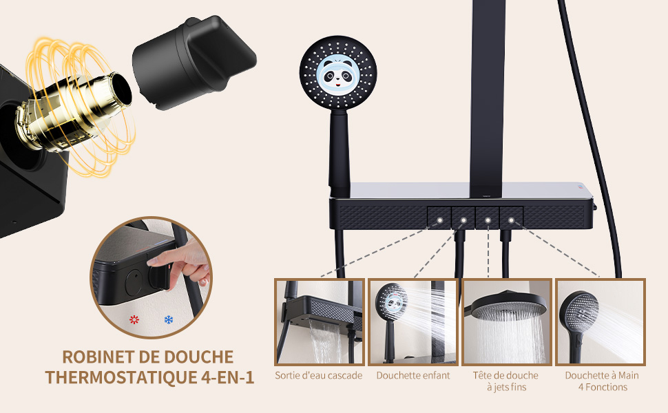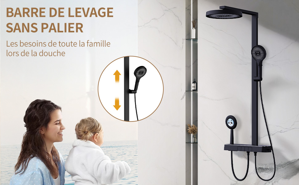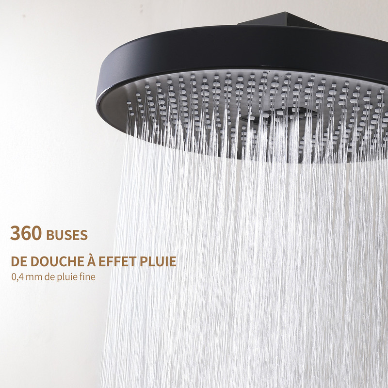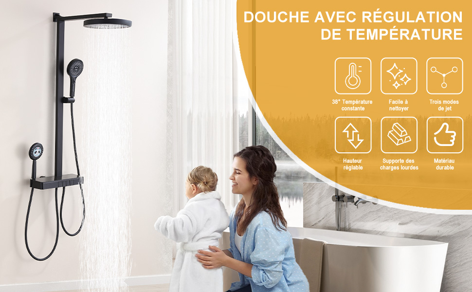 【Colonne de douche thermostatique】- avec le mélangeur de température constante, la température est maintenue dans la sécurité 38 degrés celsius, dispositif anti-brûlant intégré, protégez les enfants et les personnes âgées, fournissez l’environnement confortable et sûr de douche.
