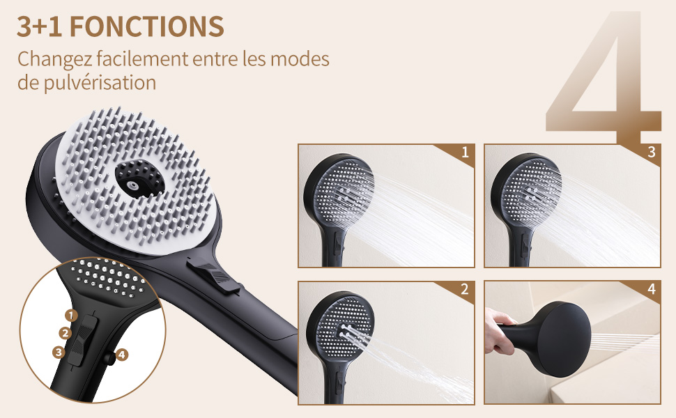 【4 types】- Rond Douchette à main 130 mm,latérale de tête reglable hauteur,4 types fonctions d'eau portable (eau de douche + eau dansante + eau mélangée+ eau pour aérographe ),Flexible et réglable pour s'adapter à vos préférences,meilleur soulagement de la fatigue.