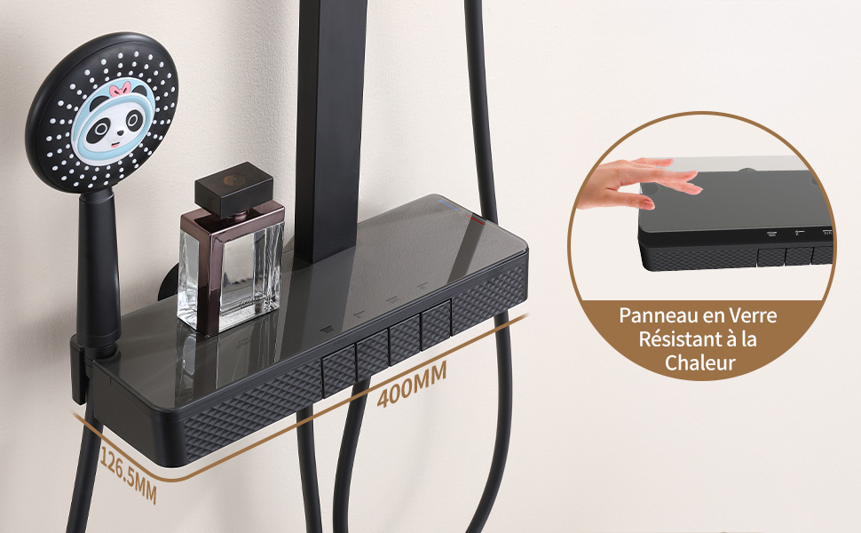 【Grande plate-forme】- La grande plate-forme de 40*12.7cm pour placer les articles de toilette nécessaires permet d'utiliser pleinement l'espace limité de la salle de bains. Surface en verre trempé, facile à nettoyer.Les boutons sur le thermostat permettent de basculer facilement entre la douche de tête, la douchette à main,Régulation facile du flux d'eau pour une,expérience de douche unique.