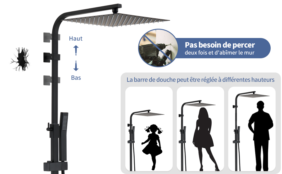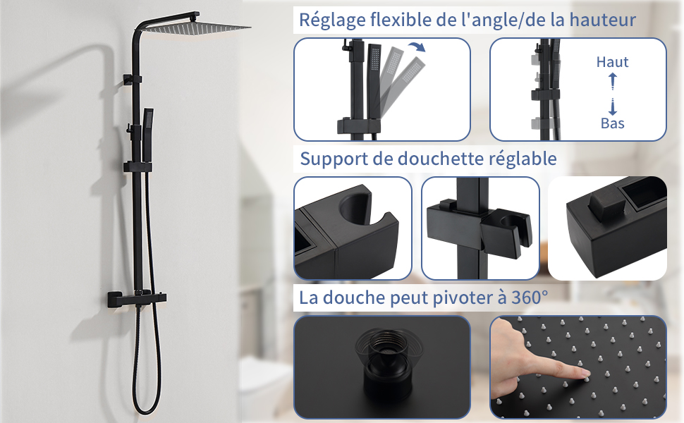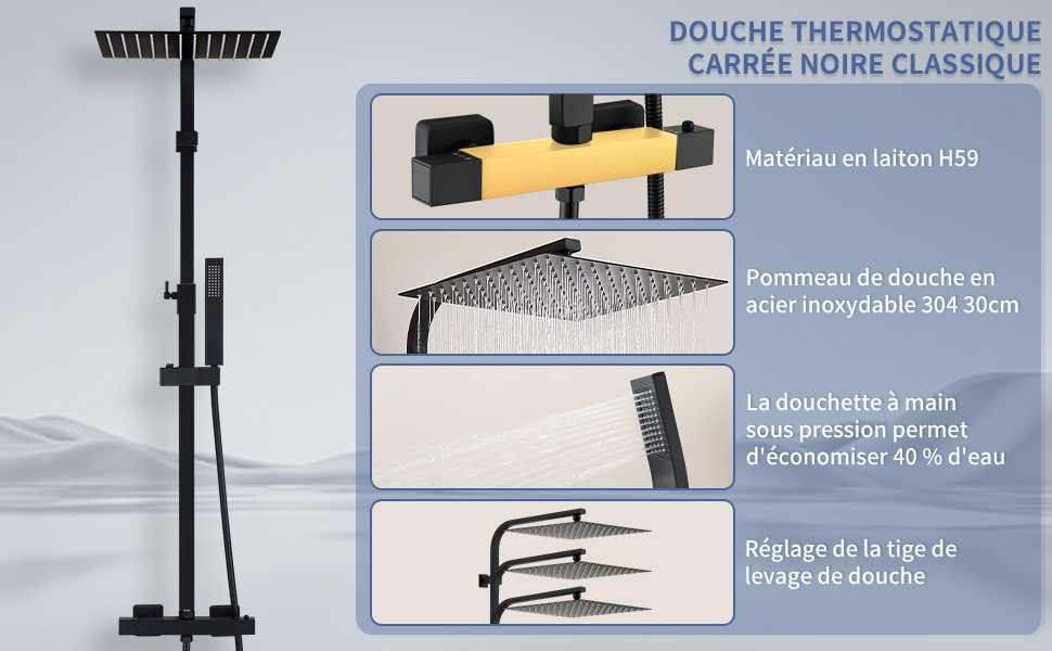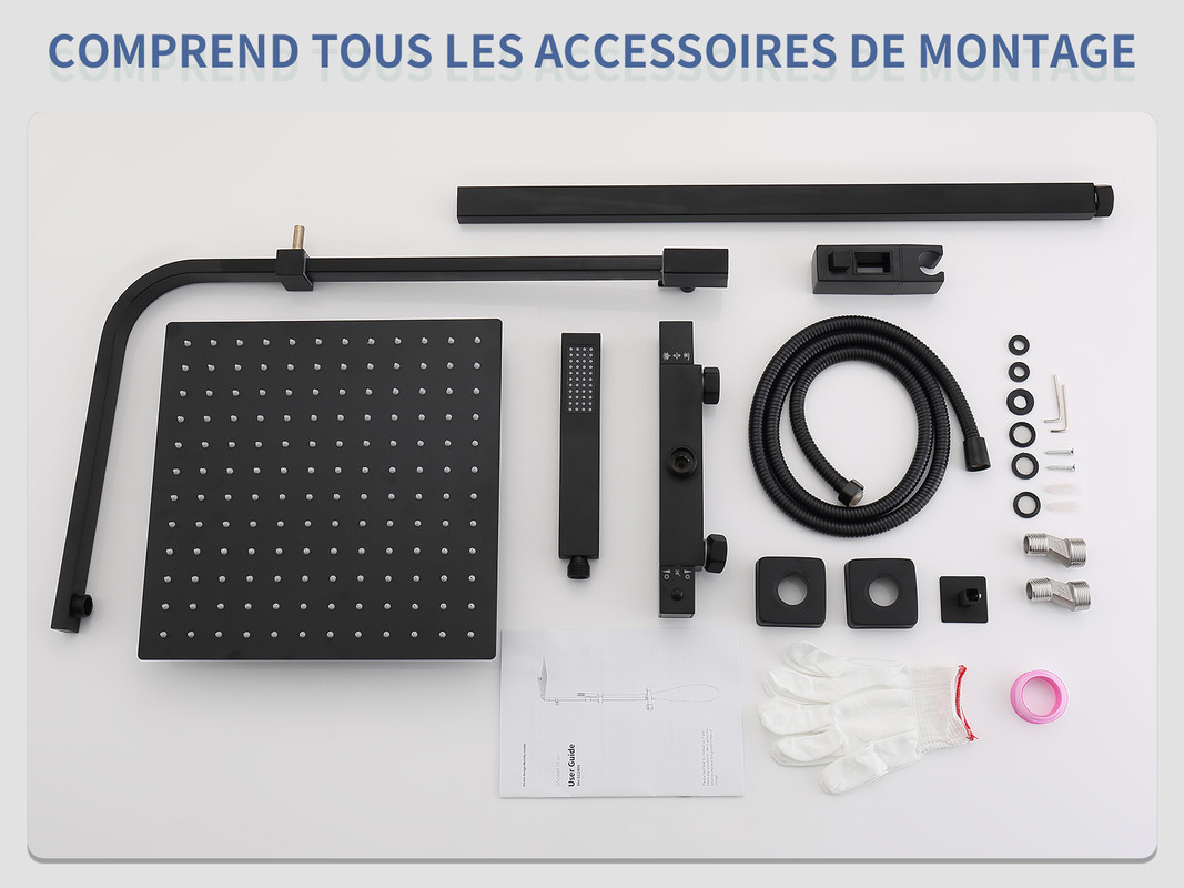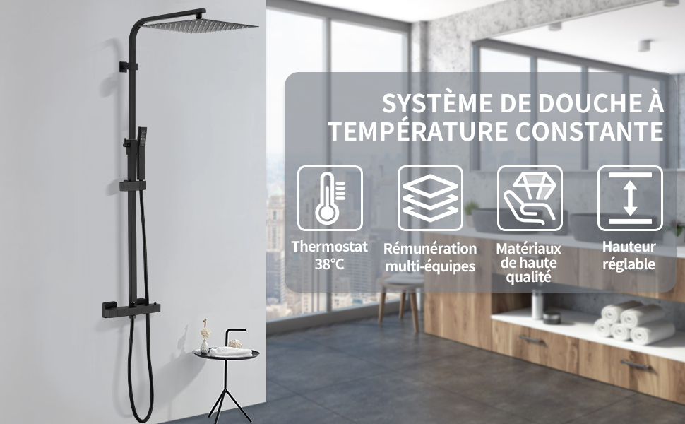 Nous vous propose cette ensemble de douche avec mitigeur thermostatique,le design carré chromé est simple et élégant. Colonne de douche thermostatique avec tête de douche carré ultra-mince de 12 pouces. Système de douche hauteur réglable répondre aux besoins de toute la famille.