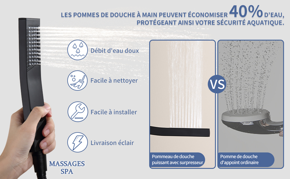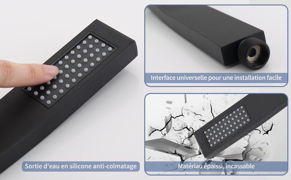 La douchette à main en acier inoxydable 304 permet d'économiser 40 % d'eau par rapport aux autres douches. Le silicone empêche le colmatage de la sortie d'eau et a une fonction de purification de l'eau.