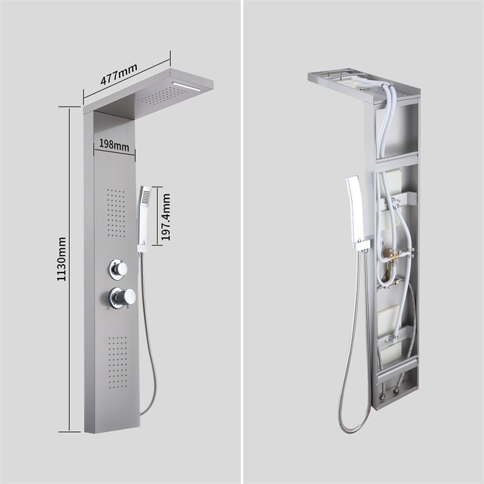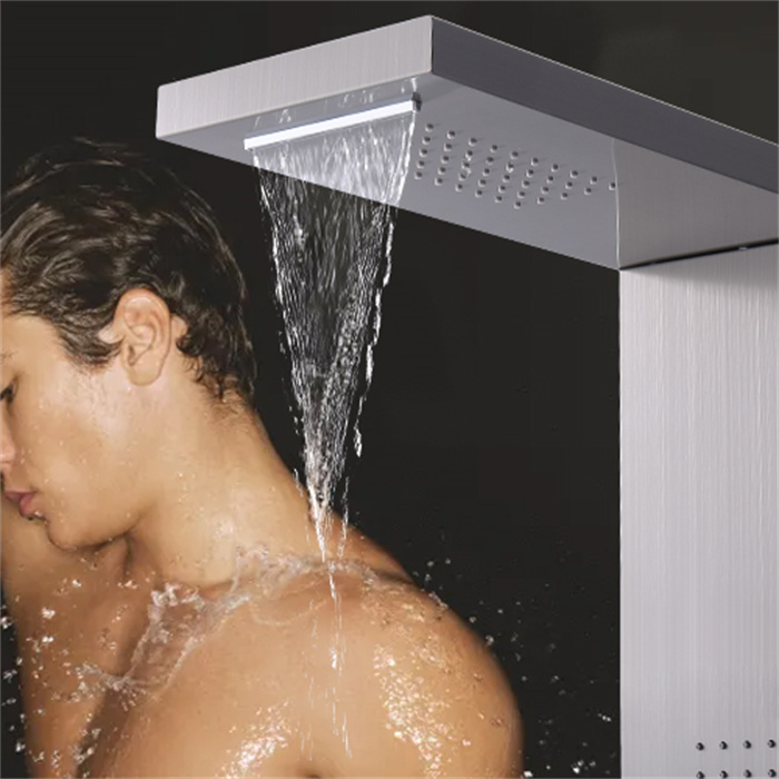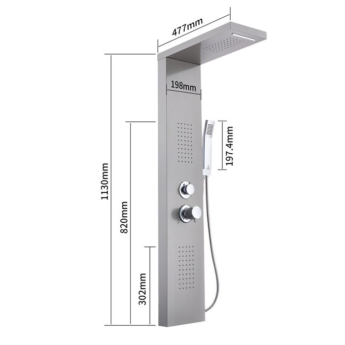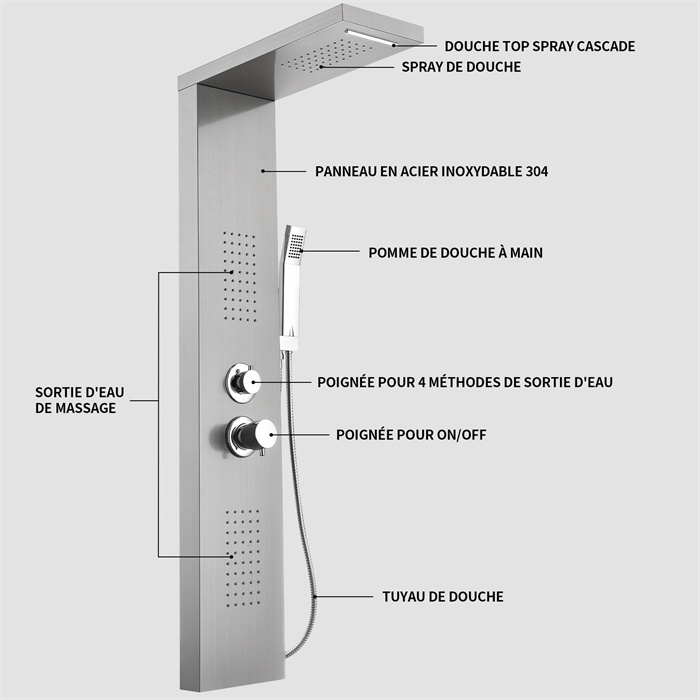 Panneau de Douche Colonne de Douche Hydromassante Quatre Fonctions de Sortie D'eau Panneau en Acier Inoxydable Brossé MuralLe panneau de douche est en acier inoxydable 304 et en laiton. Le design carré est simple et élégant, ce qui le rend idéal pour les salles de bains. Anti-fuite, anti-âge et résistant à l'usure.