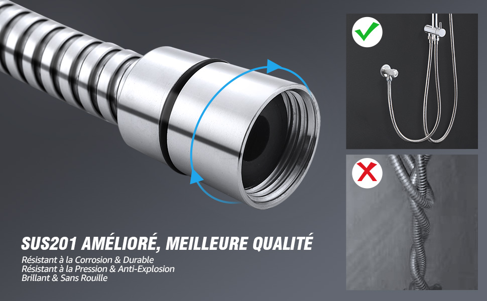 - Flexible de douche en 150 cm, Plus résistant à la pression, aux explosions et aux enchevêtrements,vous permettant de vous mouvoir librement sous la douche, de vous étirer aisément et de vous adapter avec souplesse.
