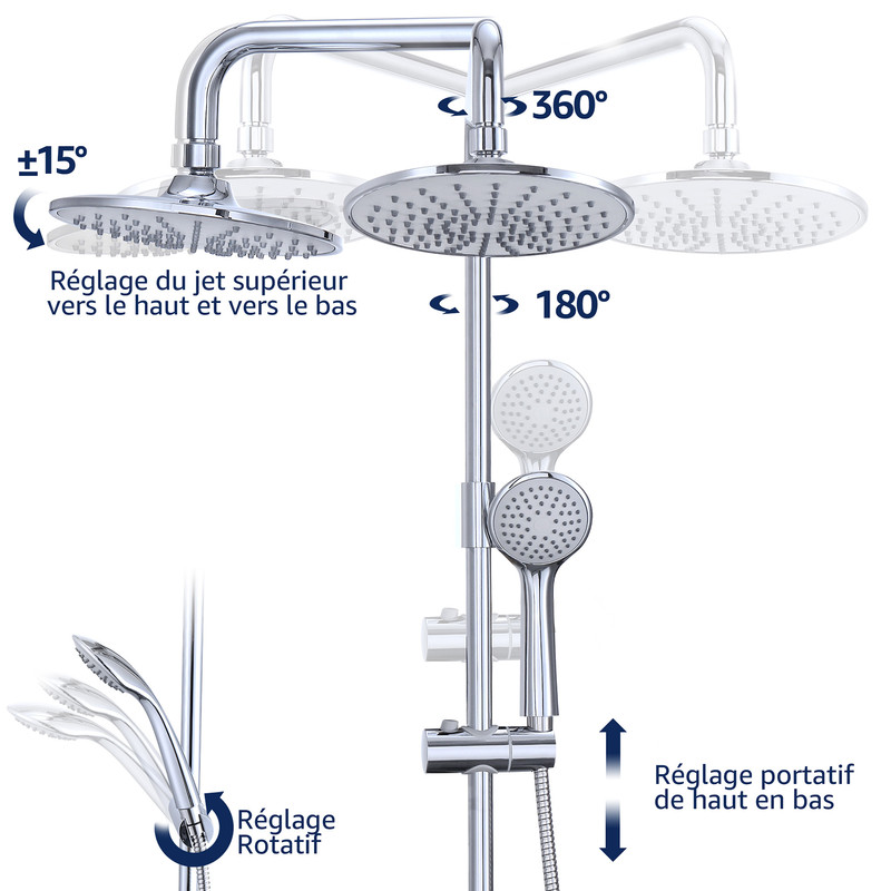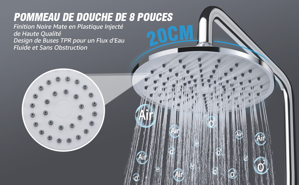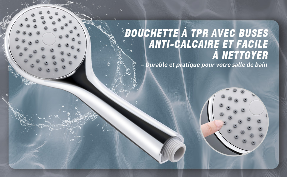- Douche de tête ronde,de Tête avec système de douche anticalcaire, buse en silicone anti-colmatage, résistant à la corrosion et aux températures élevées, facile à nettoyer, sans danger pour la santé humaine. La douche de tête peuvent être librement inclinées et tournées pour augmenter la surface de la douche.vous pouvez profiter de la douche comme la pluie.