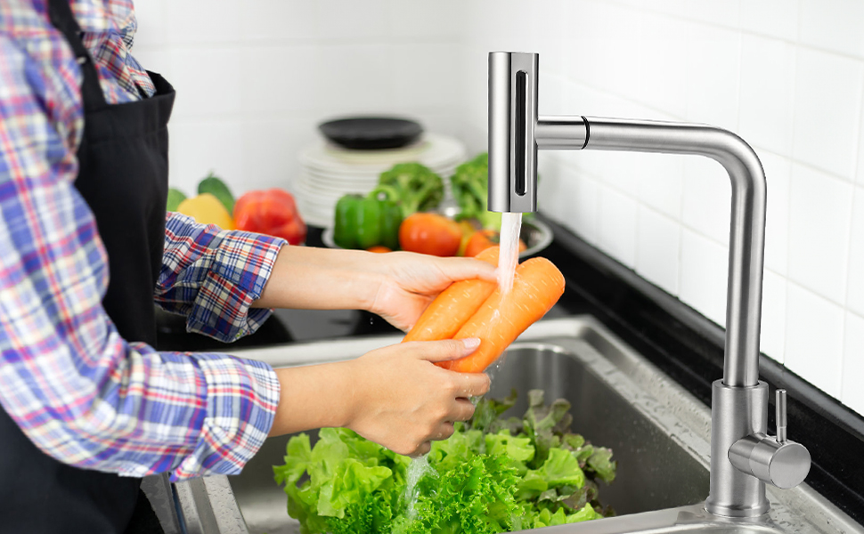 - Mitigeur de cuisine flexible: Le mitigeur de cuisine dispose non seulement d'un robinet extractible qui peut être rétracté de 30 à 50 cm, mais peut également tourner librement à 360 degrés, élargissant ainsi la plage d'utilisation du robinet de cuisine.
