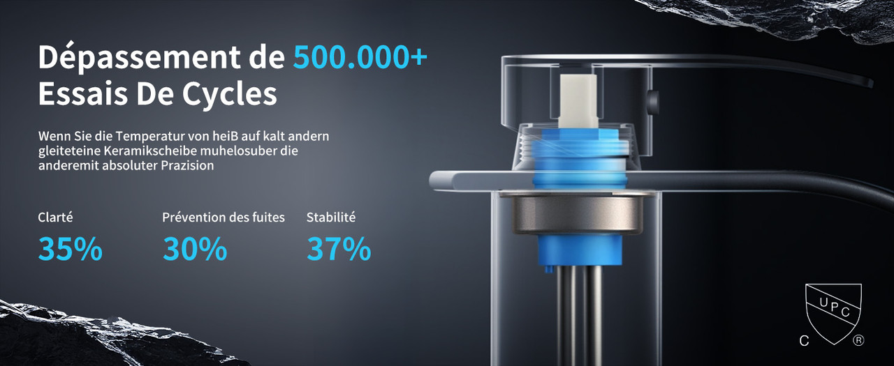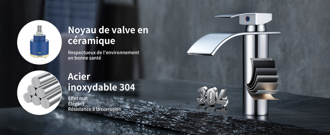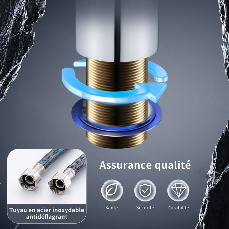 Corps du robinet en acier inox, sans plomb, résistant à la corrosion, respectueux de l’environnement, hygiénique et facile à nettoyer – un choix sain et durable pour votre salle de bain.